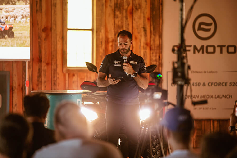 Posetioci su pozvani da se pridruže u salu u kojoj su bila atraktivno izložena CFORCE X4 i CFORCE X5 vozila koja su na sebi imala različitu dodatnu opremu koju je moguće kupiti uz samo vozilo. Domaćini su pozdravili sve prisutne i zatim ih upoznali kako sa novim vozilima i njihovim unapređenim segmentima, tako i sa istorijom CFMOTO kompanije, postignutim rezultatima, novim fabrikama i proizvodnim linijama, planovima za budućnost ali i novitetima koji se očekuju u narednom periodu u segmentima četvorotočkaša ali i dvotočkaša.